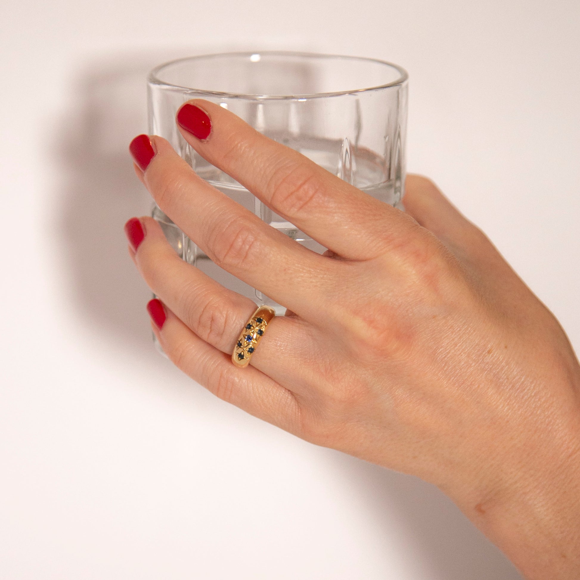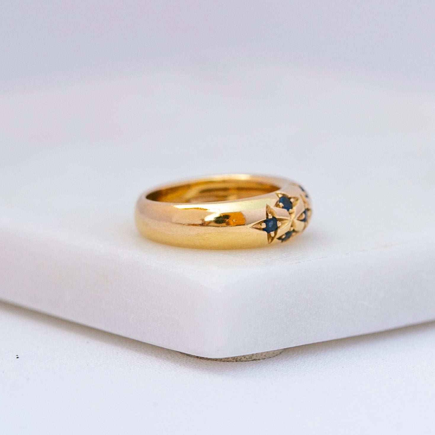An elegant French masterpiece. The Vintage Chaumet Gold & Sapphire Star Ring from the 1990s is an 18k yellow gold treasure, signed by the renowned jewelry house. This stunning piece combines luxury with a playful, cosmic flair—perfect for those who appreciate both elegance and a touch of whimsy.