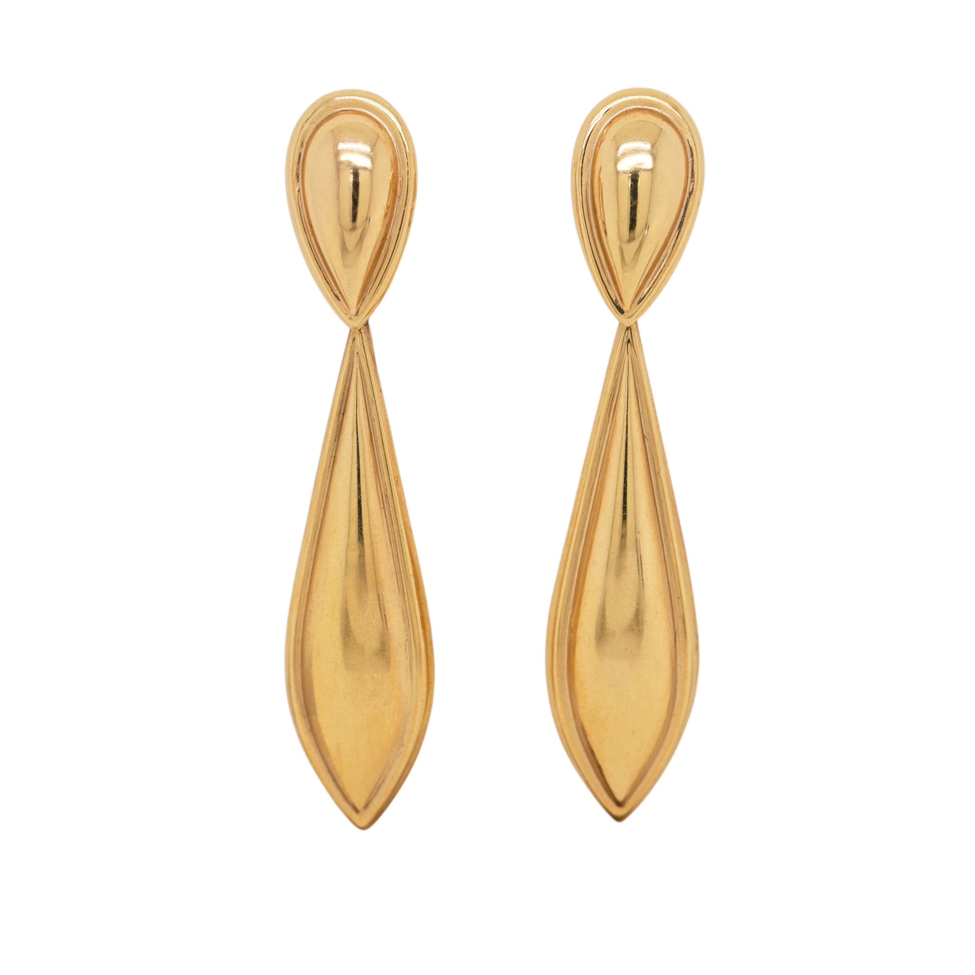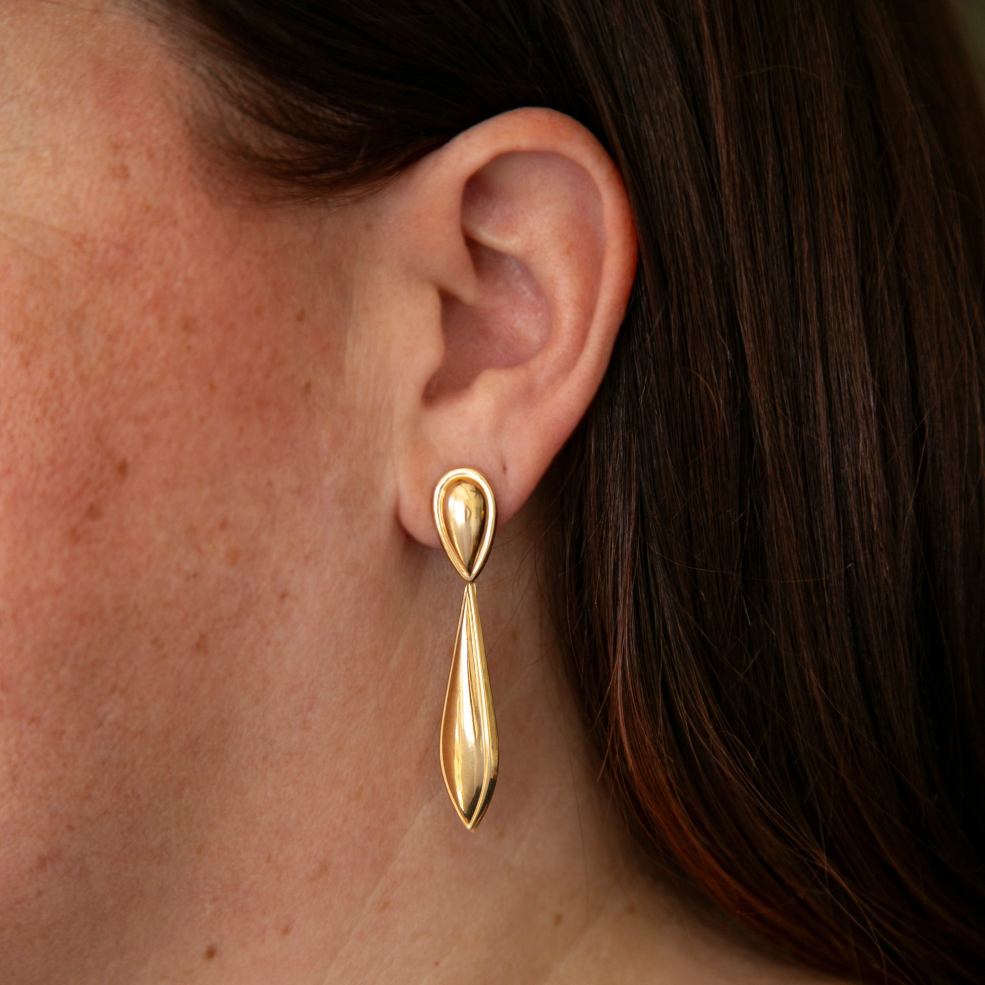 Sublime sophistication. The Long Gold Drop Earrings are crafted in 14k yellow gold, offering a sleek, stately design that gracefully elongates the neck. Their refined simplicity makes them the loveliest accessory for adding a touch of class to any outfit.