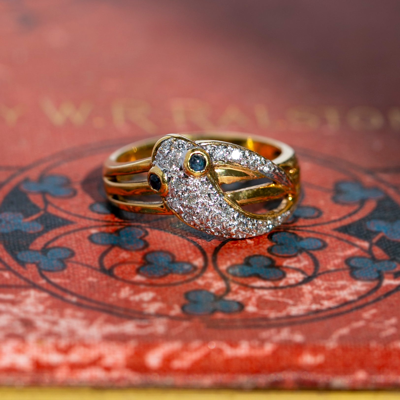 A ssssstriking vintage statement. The Mid-Century Sapphire & Diamond Snake ring showcases a brilliantly bedazzled two-tone serpent motif. The 18k white gold-topped yellow gold ring is encrusted with twenty-five Round Brilliant Cut diamonds, and accented with deep blue Cabochon Cut sapphire eyes giving it a boldly mysterious vibe. The split-shank gives this timeless motif a modern edge, and would be a fabulous addition to a collection in need of an ultra-unique snake ring.