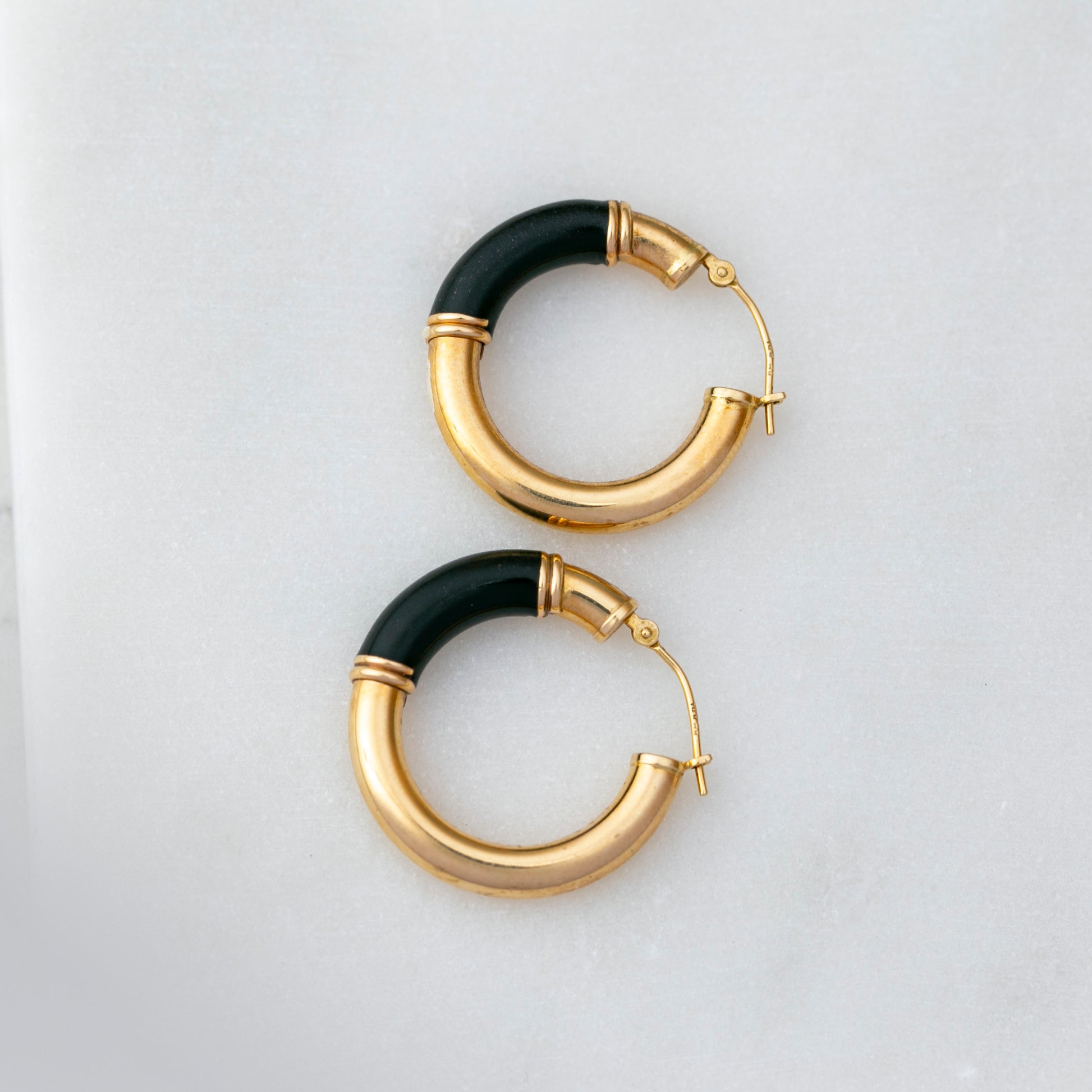 Sleek and sculptural with a bold 1960s edge. The Onyx Helium Hoops are crafted in 14k yellow gold, their rounded form accented with a glossy arc of rich black onyx. The contrast of gleaming gold and inky gemstone creates a striking two-tone effect that feels both retro and timeless. Lightweight yet impactful, these hoops are a chic statement for any jewelry lover.
