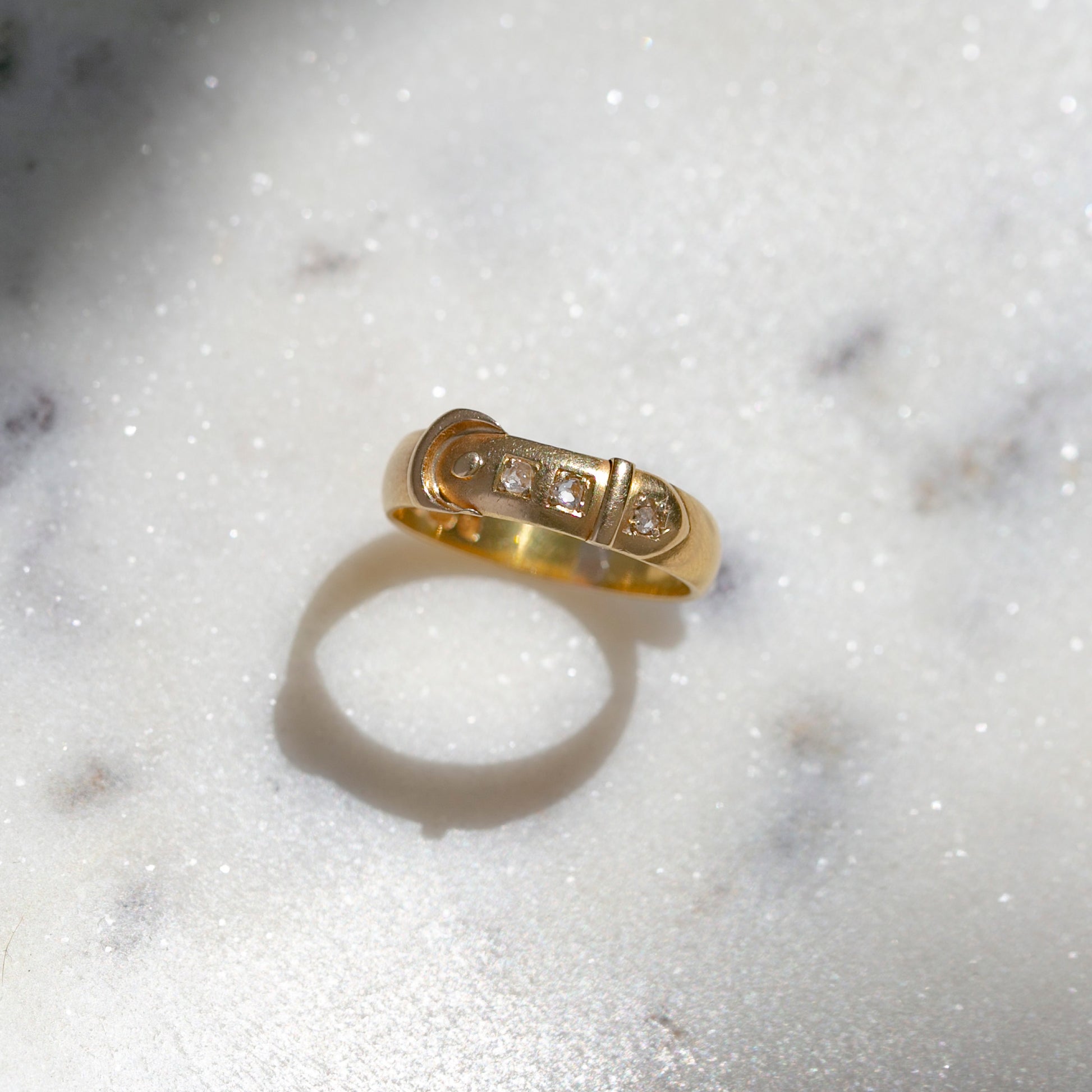 A sentimental Victorian staple. The Victorian Buckle Ring is a classic 18k yellow gold design symbolizing loyalty, protection, and enduring love. Three petite diamonds are set flush into the band, adding a delicate glimmer to this meaningful motif. With its romantic symbolism and unmistakably antique charm (English hallmarks? *SWOON*), this piece brings depth, history, and quiet elegance to any jewelry collection.