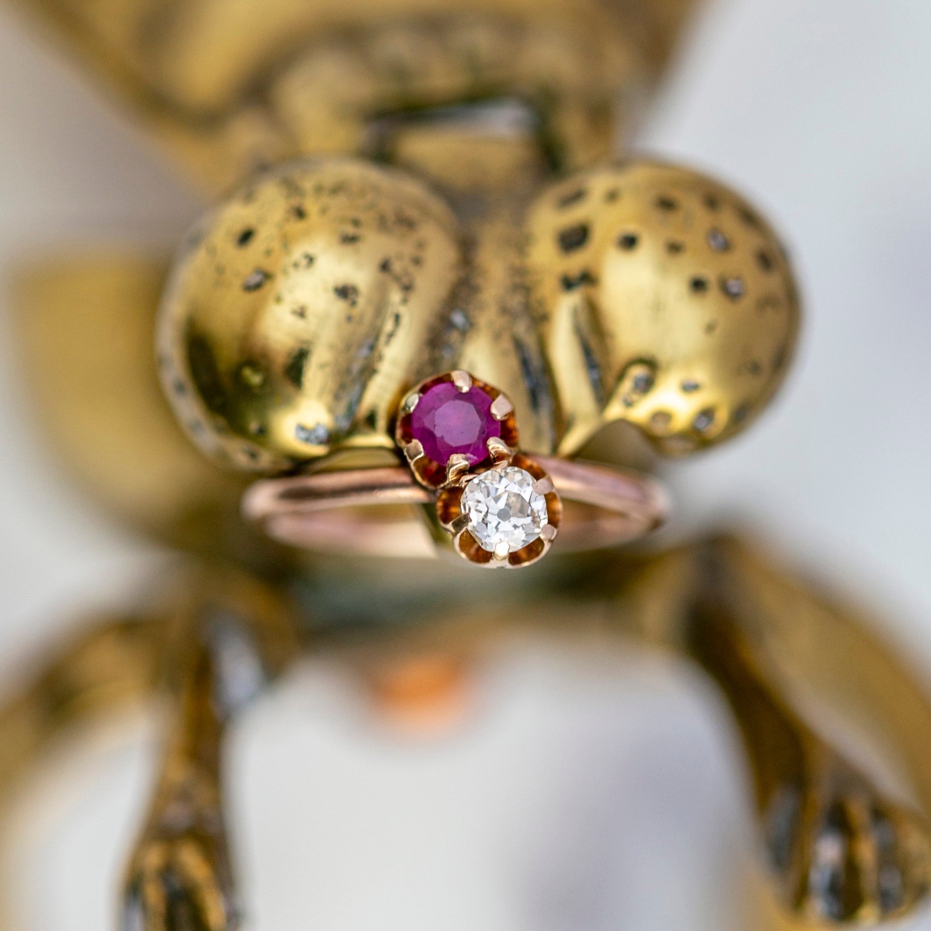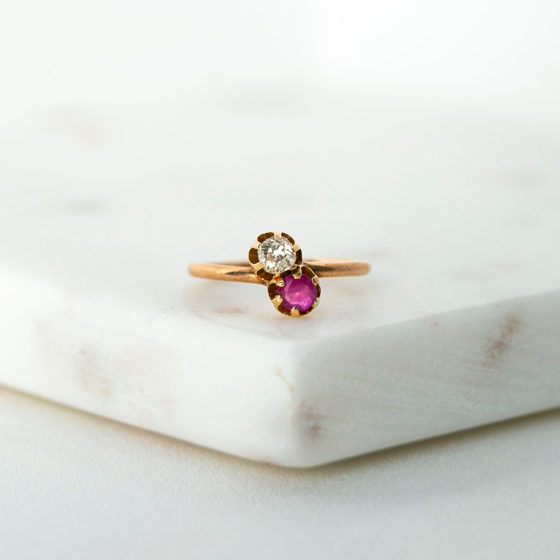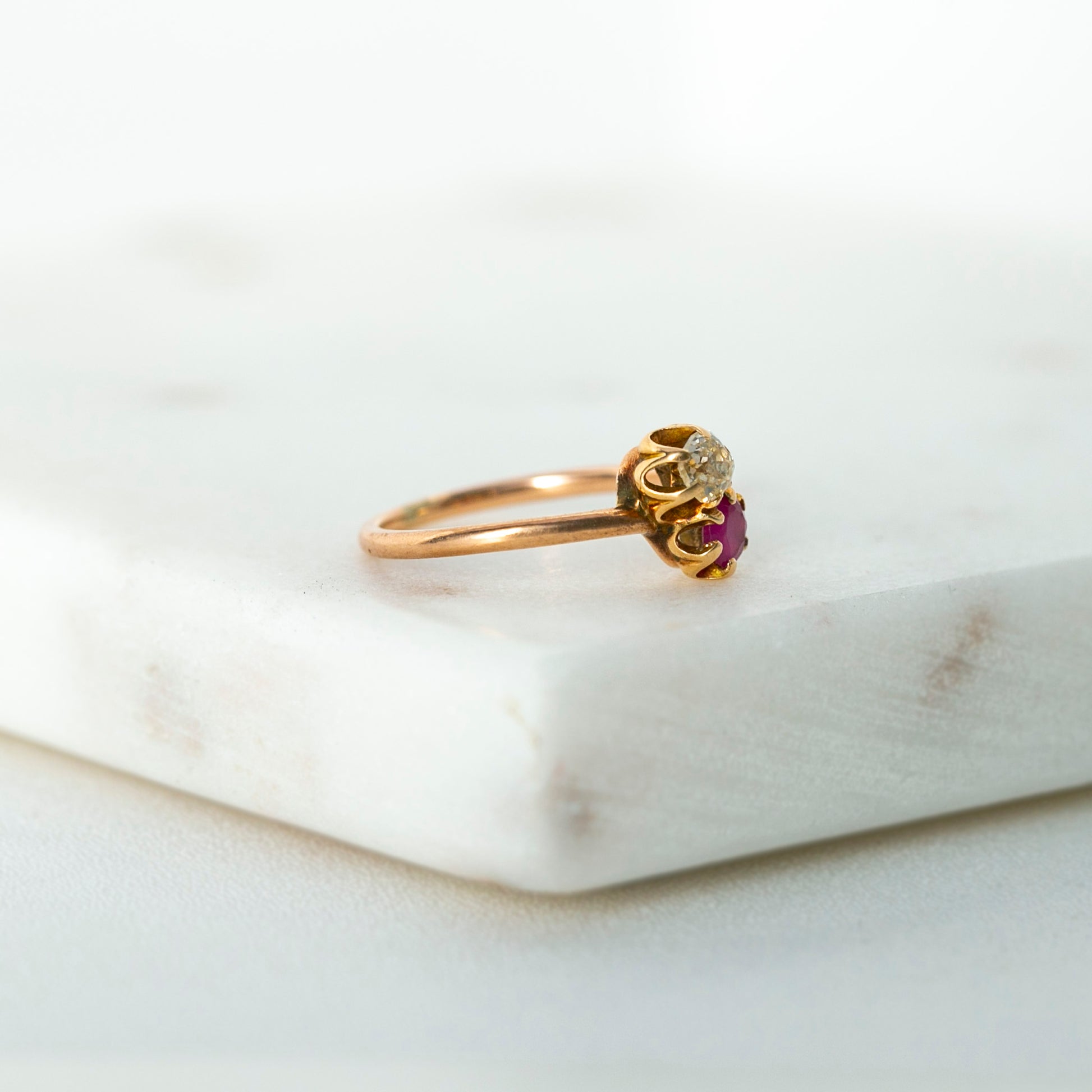 A romantic jewel steeped in symbolism. This Victorian Toi et Moi ring is crafted in warm 14k rose gold, featuring a sparkling 0.20ct Old Mine Cut diamond paired with a vivid round ruby. The two stones, set side by side, represent the union of two souls, a design beloved in the 19th century for its sentiment and elegance. With its graceful simplicity and timeless meaning, this ring is a true Victorian treasure.
