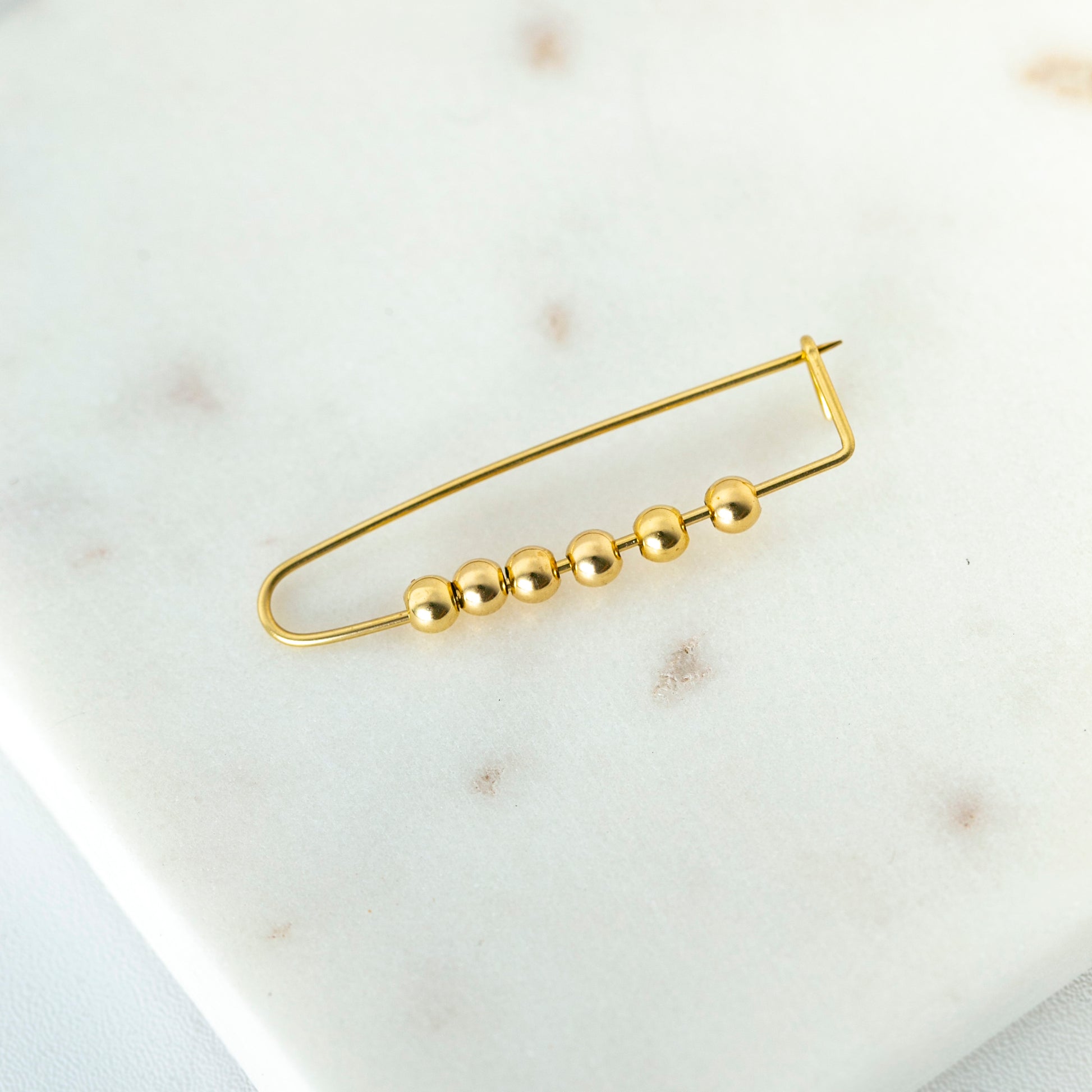 Playful yet practical, this Vintage Safety Pin Charm Holder is crafted in 14k yellow gold. Designed with five polished gold beads strung along the pin, it offers both a stylish accent and a functional way to display multiple charms. A whimsical nod to Retro design, this piece is perfect for creating a personalized collection that tells your story in gold.
